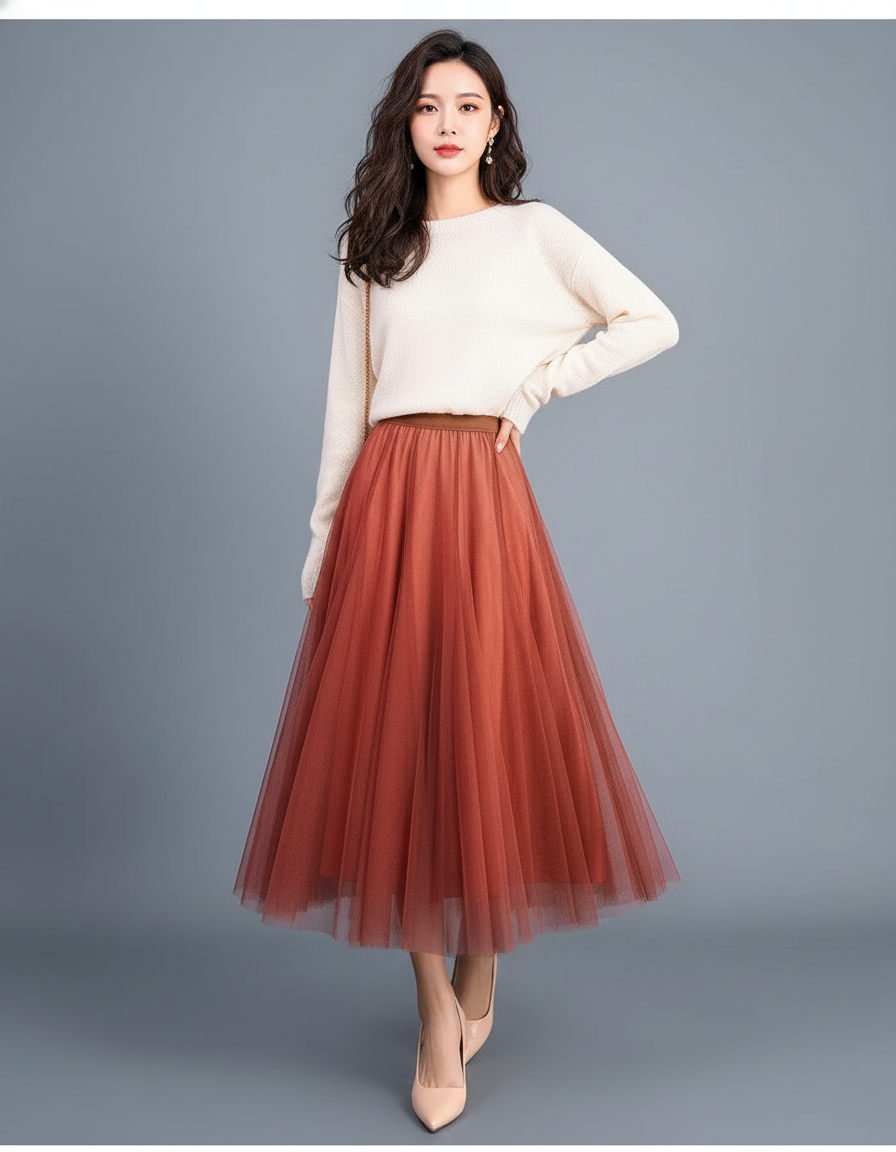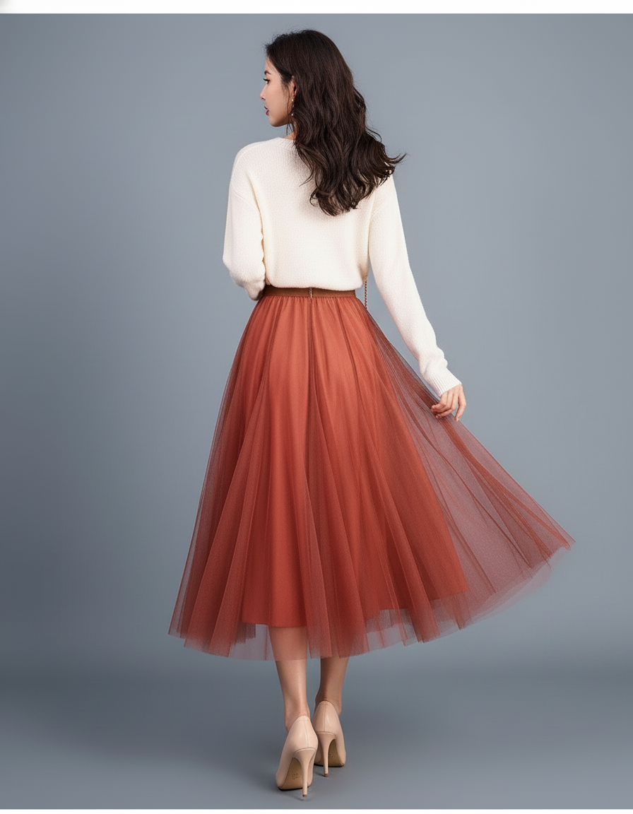 La Jupe Patineuse Tulle Rouille Élégante est votre atout séduction pour transformer chaque rendez-vous en un moment mémorable. Sa teinte rouille profonde, à la fois chaleureuse et sophistiquée, attire le regard sans effort. Pour une allure romantique et chic, associez-la à un chemisier en soie crème ou un pull fin en cachemire, comme sur l'image, et des escarpins nude. Ajoutez quelques bijoux discrets pour parfaire ce look qui respire la confiance et la féminité. Elle est également idéale pour un dîner élégant ou une sortie culturelle, prouvant sa polyvalence avec raffinement.