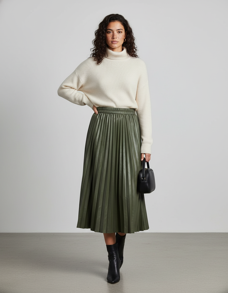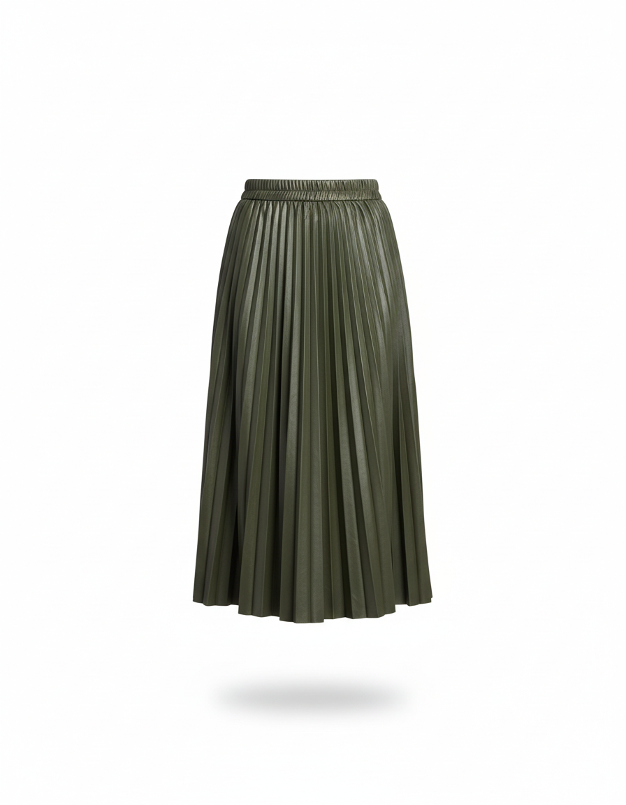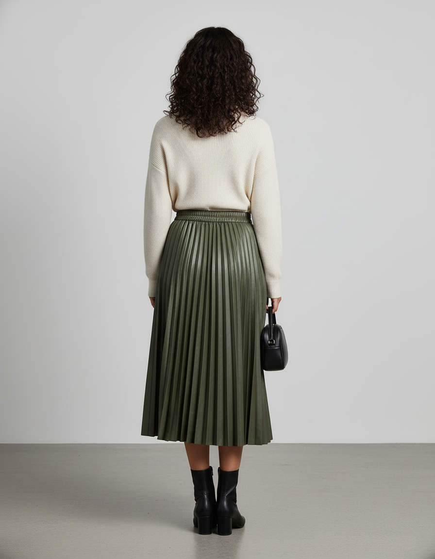 Confectionnée dans un simili cuir de haute qualité, son plissé impeccable et sa teinte kaki profonde offrent une texture et une richesse visuelle incomparables. Sa coupe midi fluide s'adapte parfaitement, que vous l'associiez à un pull douillet pour un look de jour chic ou à un top en soie et des talons pour une soirée distinguée. C'est la pièce versatile par excellence qui transforme instantanément n'importe quelle tenue, vous distinguant avec une sophistication sans effort.
