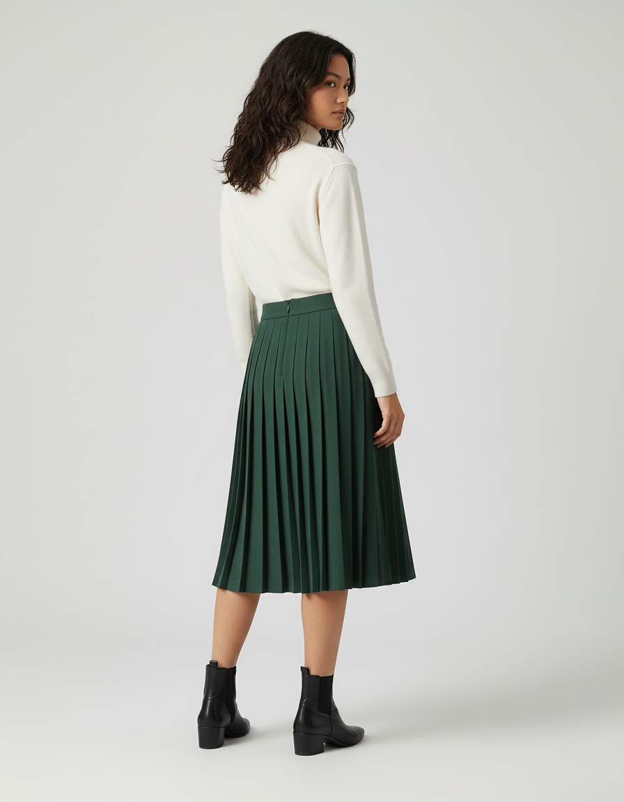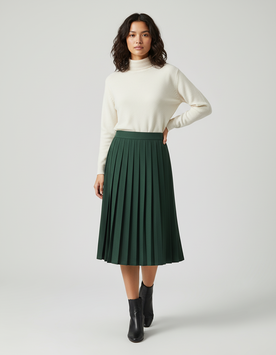 La Jupe Patineuse Verte Plissée Élégante est la pièce maîtresse d'une garde-robe raffinée. Pour un look professionnel impeccable, associez-la à un col roulé crème et des bottines noires, comme sur notre visuel, pour une silhouette chic et intemporelle. Sa teinte verte profonde offre une polyvalence surprenante, se mariant aisément avec des chemisiers en soie, des blazers ajustés ou même des mailles fines pour des journées de bureau ou des rendez-vous d'affaires. Osez l'accessoiriser pour passer du travail à un dîner élégant en un clin d'œil.