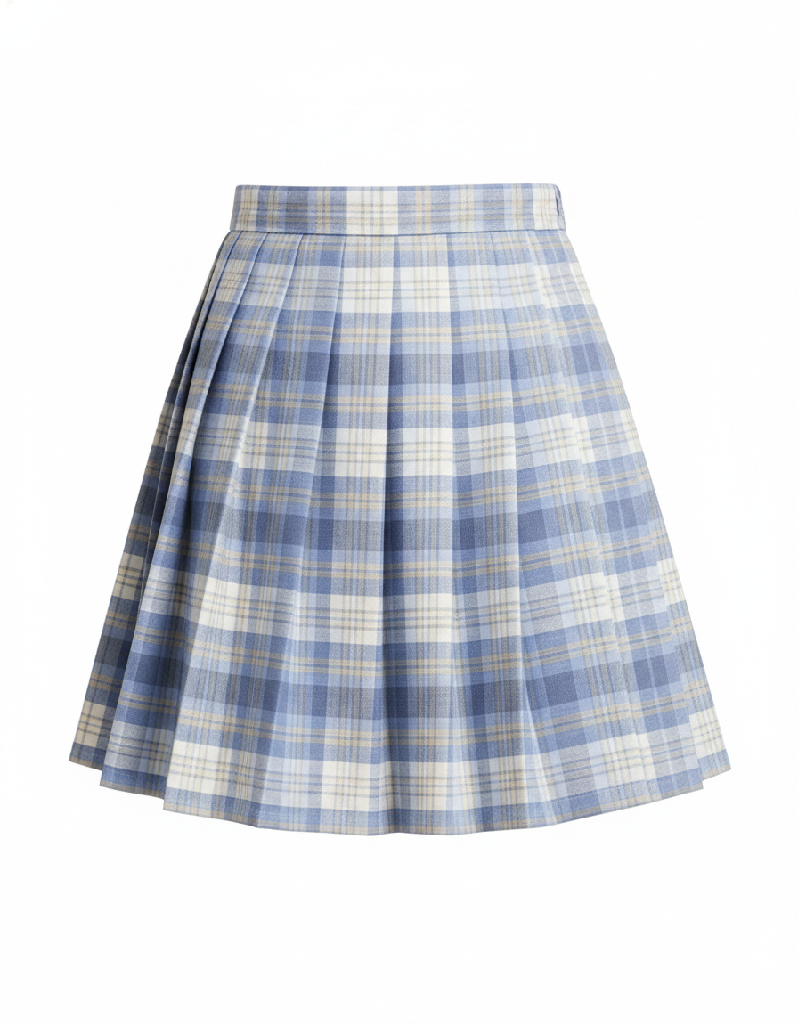 Cette jupe patineuse présente un motif à carreaux plissé. Elle est de coupe courte et affiche des teintes de bleu clair, de blanc et de beige.