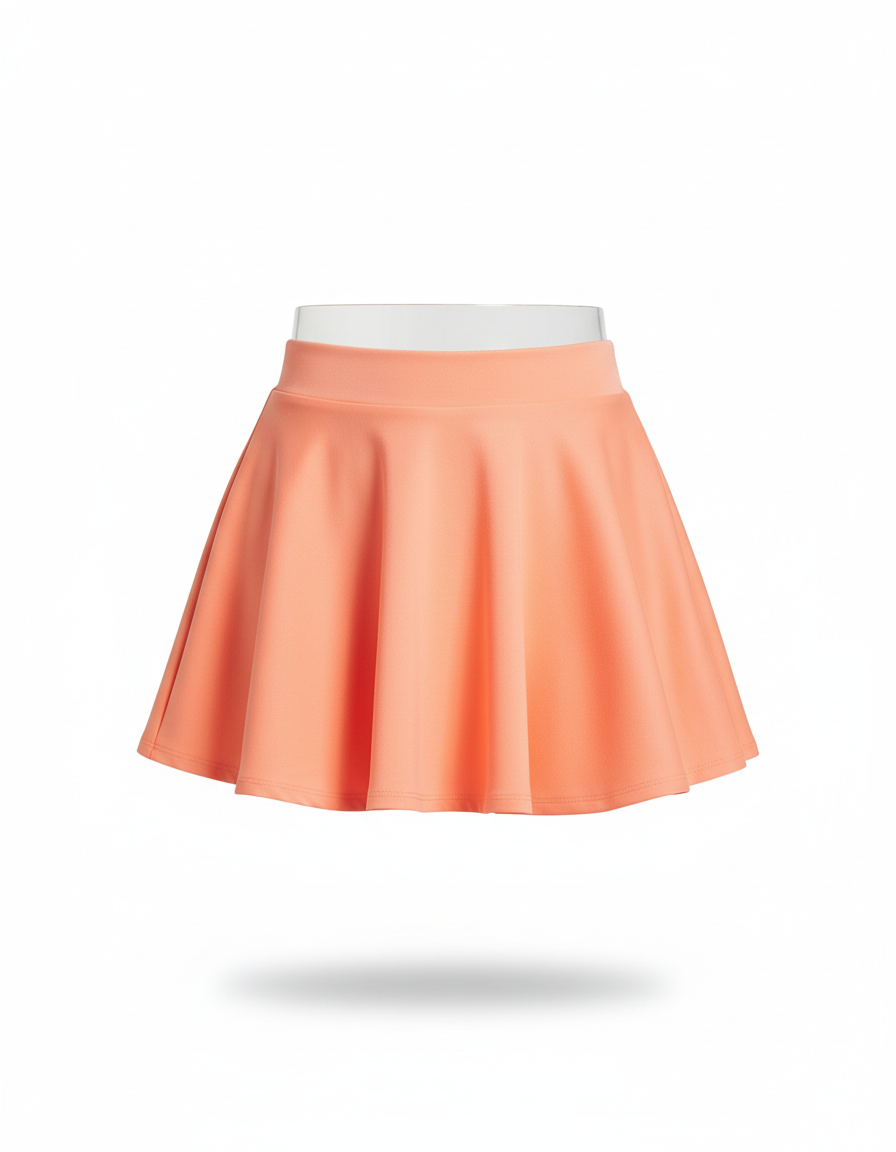 Cette jupe patineuse présente une coupe évasée et une longueur courte, arrivant au-dessus du genou. Elle est de couleur orange corail unie.