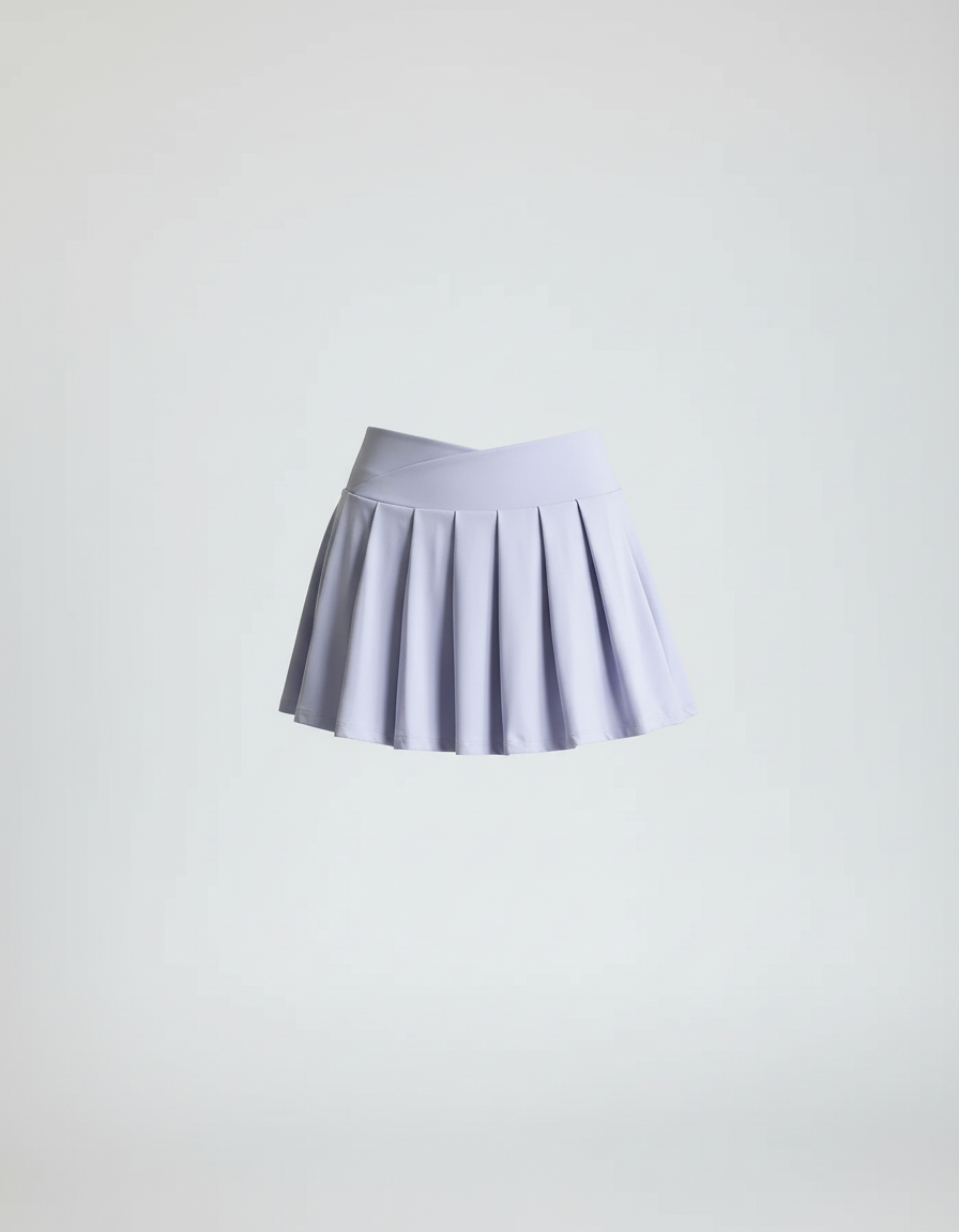 Cette jupe courte présente une coupe évasée et des plis réguliers. Elle est de couleur violette claire et arrive au-dessus du genou.