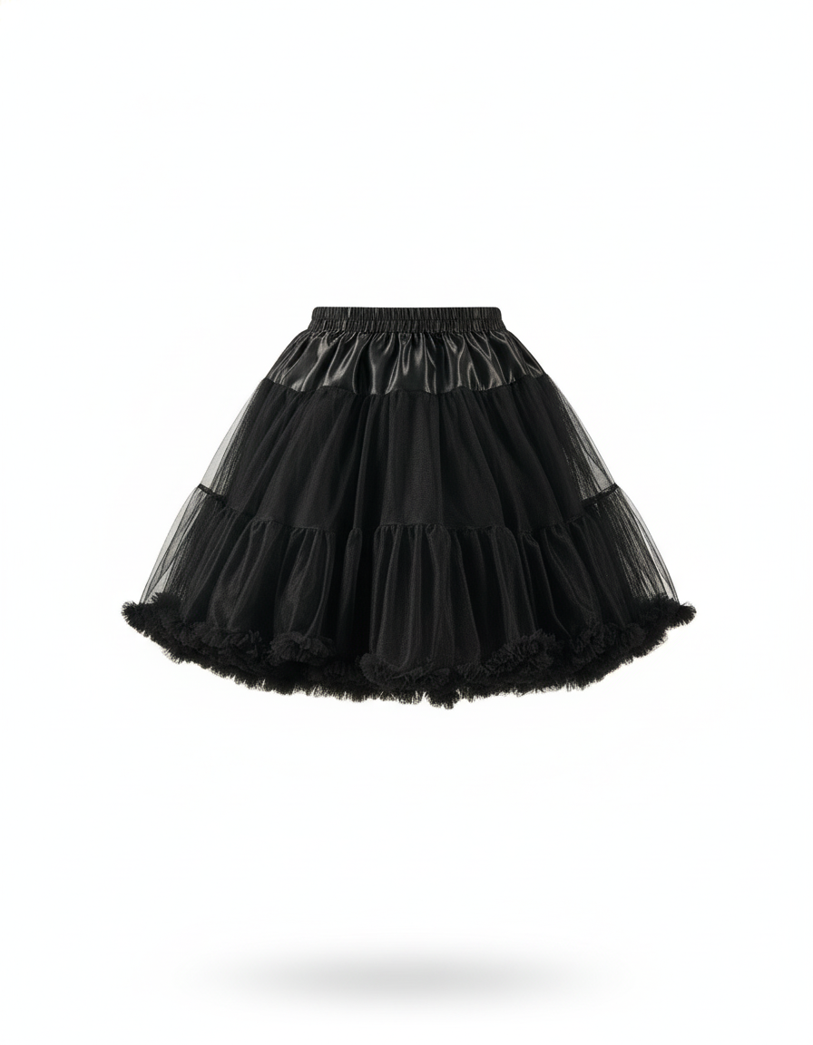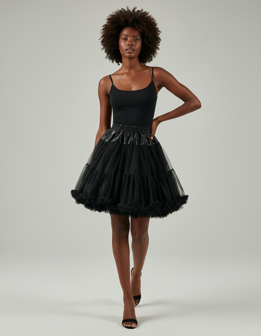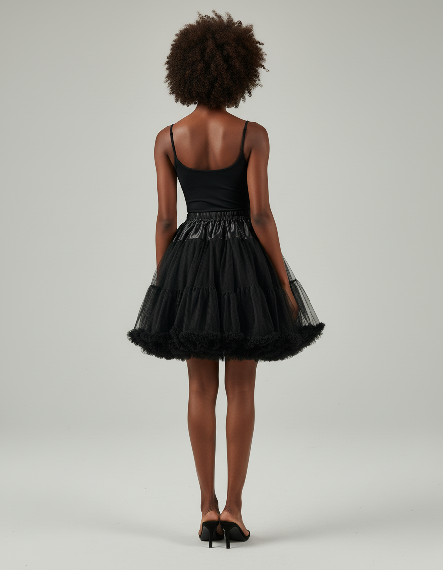 Cette jupe est une jupe patineuse de couleur noire, caractérisée par son volume et ses volants superposés.
