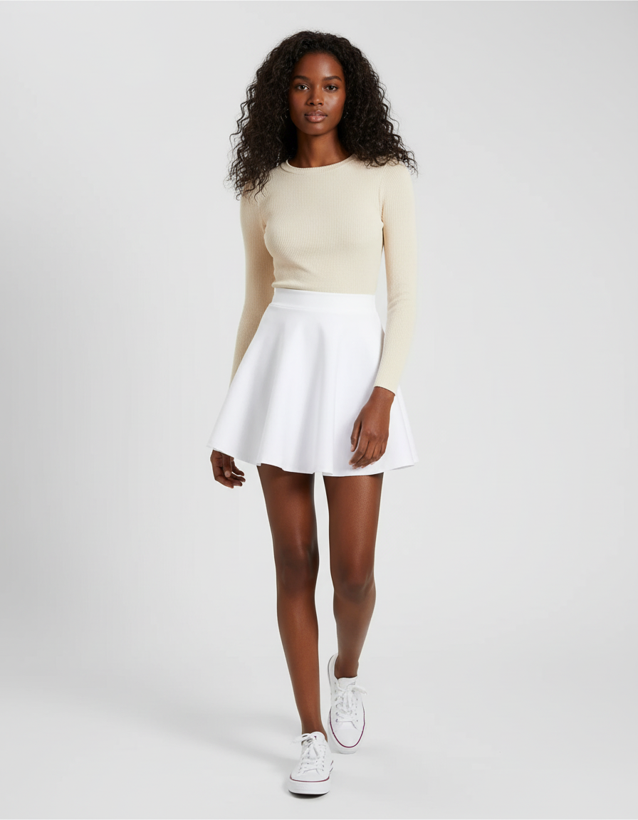 Pour un look quotidien chic et sans effort, associez-la à un pull fin en maille ou un t-shirt ajusté, complété par des baskets épurées, comme illustré. En soirée, transformez-la avec un top en soie raffiné et des talons pour une allure sophistiquée et audacieuse. Son blanc éclatant offre une toile vierge pour toutes vos audaces stylistiques, permettant des associations infinies. La Jupe Rigide Patineuse est plus qu'une simple jupe ; c'est une invitation à exprimer votre style avec assurance et confort, du matin au soir.